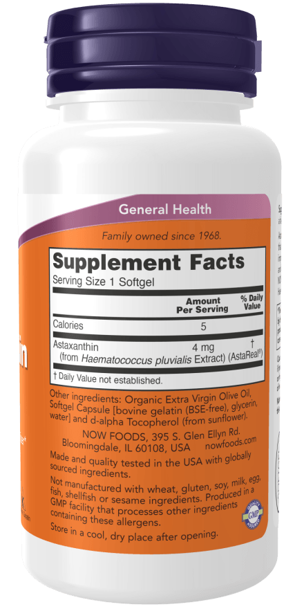 Astaxanthin is a naturally occurring carotenoid that, due to its unique structure, performs an important role in cellular free radical protection and healthy immune system responses. NOW® Astaxanthin is derived from Non-GMO Haematococcus pluvialis microalgae.