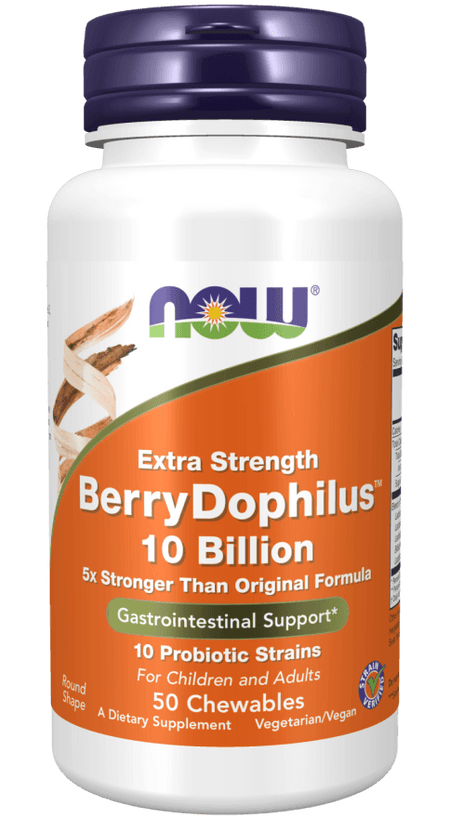 NOW® Extra Strength BerryDophilus™ provides 10 Billion CFU from a combination of 10 clinically validated probiotic bacterial strains designed to support gastrointestinal health and healthy immune system function.* Healthy intestinal flora also helps to create a favorable environment for the absorption of nutrients.* BerryDophilus™ can be used by both adults and children.