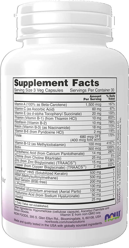 NOW® Solutions Clinically Advanced Hair, Skin & Nails is formulated to nurture hair, skin, and nails from the inside. This product features Cynatine® HNS a revolutionary bioavailable form of solubilized keratin that can help you maintain full, lustrous hair and nails that are strong and flexible.* Cynatine® HNS can also help the skin to retain its youthful moisture and elasticity, as well as battle signs of aging associated with free radicals.* This product also has other critical nutrients necessary for the support and maintenance of the skin’s healthy and youthful appearance.*