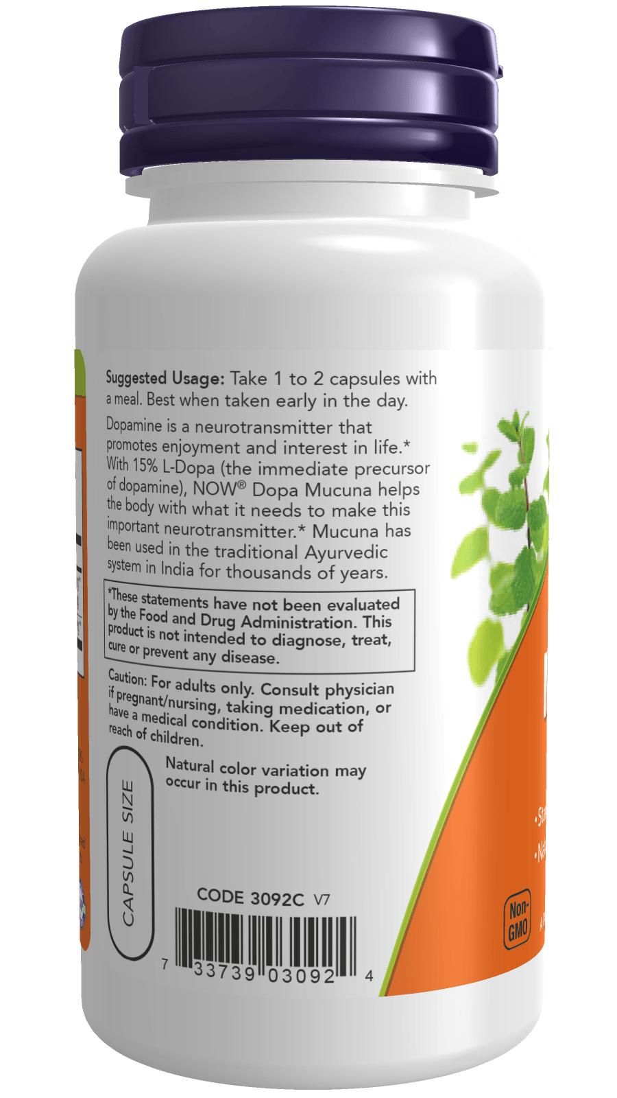 Dopamine is a neurotransmitter that promotes enjoyment and interest in life.* With 15% L-Dopa (the immediate precursor of dopamine), NOW® Dopa Mucuna helps the body with what it needs to make this important neurotransmitter.* Mucuna has been used in the traditional Ayurvedic system in India for thousands of years.