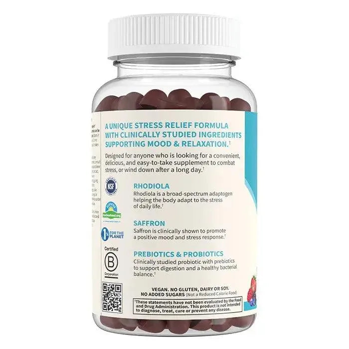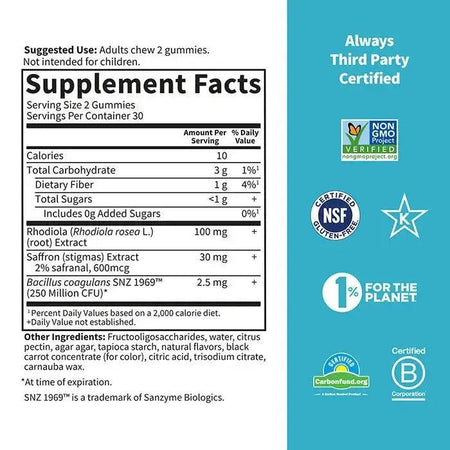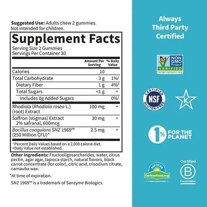 These delightful gummies feature 100mg of rhodiola, an adaptogen known to help the body manage stress. They also include 30mg of saffron, a spice traditionally used and clinically proven to support mood and stress balance. Additionally, they contain clinically researched soil-based probiotics and prebiotics to promote digestive wellness.