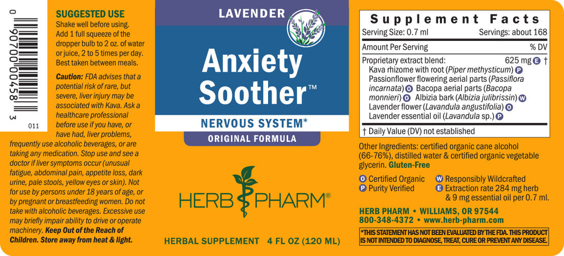 Mind Soother™: Lavender features Kava prepared from the rhizome and root of noble varieties of Piper methysticum plants grown and harvested in Vanuatu. It also features Passionflower prepared from the flowering aerial parts (leaf, flower and stem) of Certified Organic Passiflora incarnata vines.