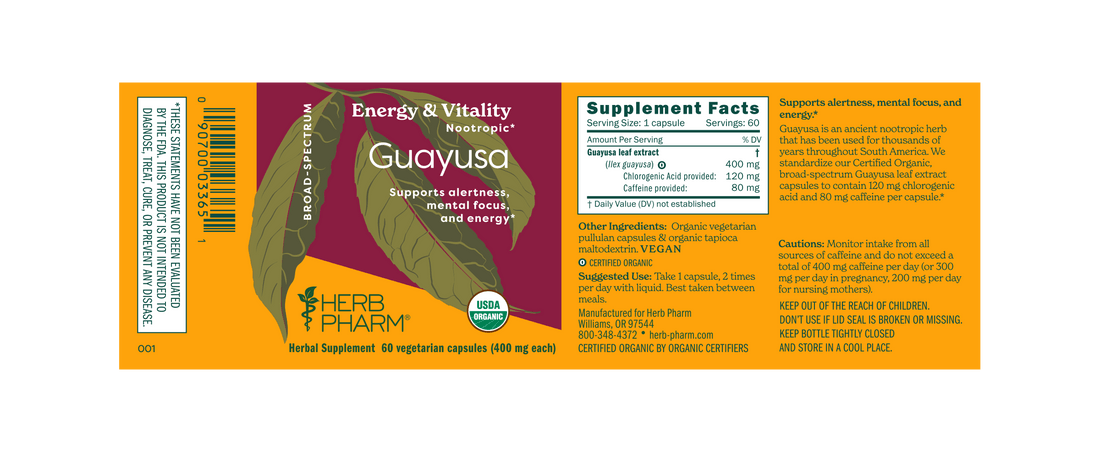 Herb Pharm's Guayusa capsules provide 120 mg chlorogenic acid and 80 mg caffeine per capsule.