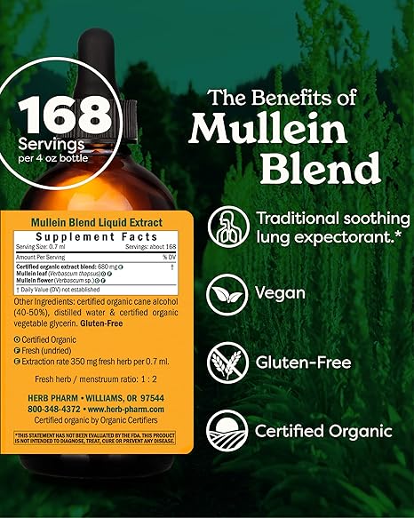 Our Mullein Blend extract is a proprietary mix of the Certified Organic leaf and flower of Verbascum spp. plants grown on our own farms in southern Oregon. The leaf and flower are hand-harvested each summer at their optimal peak and are extracted fresh the same day they are harvested.