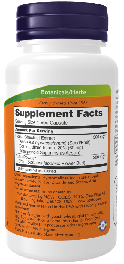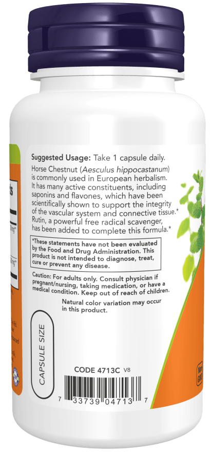 Horse Chestnut (Aesculus hippocastanum) is commonly used in European herbalism. It has many active constituents, including saponins and flavones, which have been scientifically shown to support the integrity of the vascular system and connective tissue.* Rutin, a powerful free radical scavenger, has been added to complete this formula.*