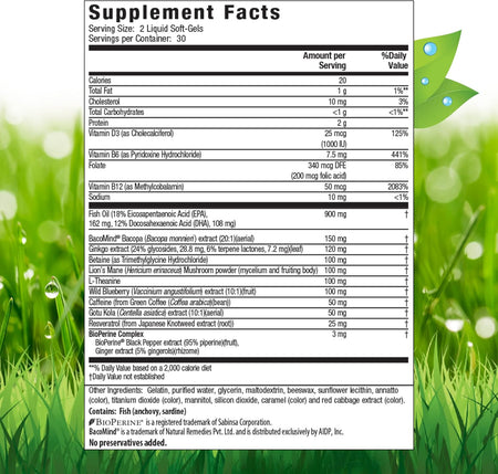Resveratrol in combination with targeted B-Vitamins that play important roles in the vascular health of the brain by supporting the healthy metabolism of homocysteine. Additionally, this formula delivers the nootropic mushroom Lion’s Mane along with concentrated Wild Blueberry Extract, Vitamin D3, and Omega-3 dense fish oil standardized to EPA and DHA for additional brain longevity support