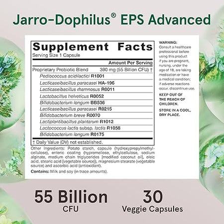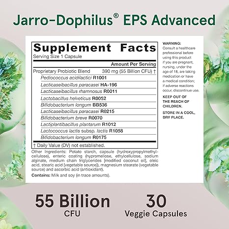 These capsules (EnteroGuard®) contain 10 strains of probiotic bacteria that are protected from stomach acid, ensuring that the potency of friendly bacteria reaches your gut to promote a healthy gut and mood support. Jarro-Dophilus® EPS is blister-packed to safeguard against moisture and remains stable at room temperature, eliminating the need for refrigeration.