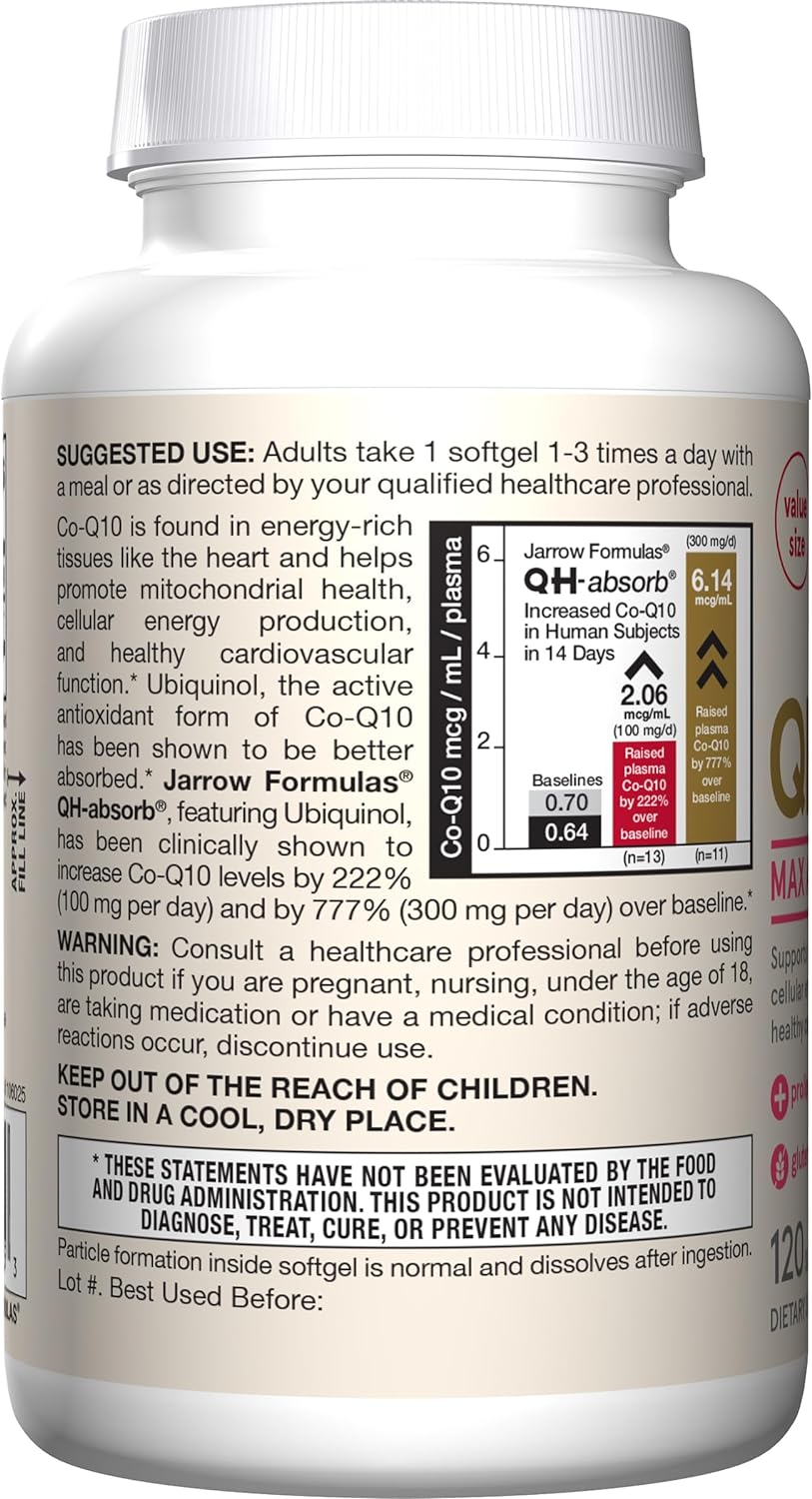 Co-Q10 is found in energy-rich tissues like the heart and supports mitochondrial health and energy production, the health benefits of which support cardiovascular function. Ubiquinol, the reduced, active, antioxidant form of Co-Q10 is significantly better absorbed than regular Co-Q10. Jarrow Formulas' proprietary QH-absorb® formula has been shown clinically in humans to increase Co-Q10 levels by 222% (100 mg per day) and by 777% (300 mg per day) over baseline.