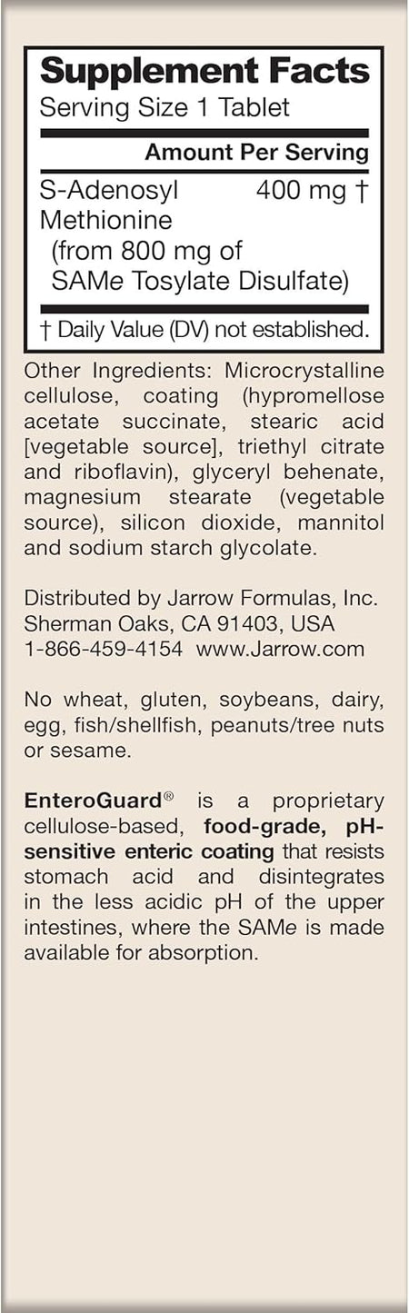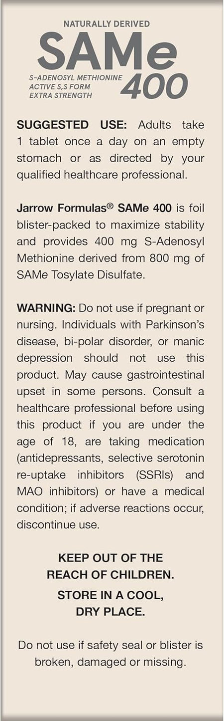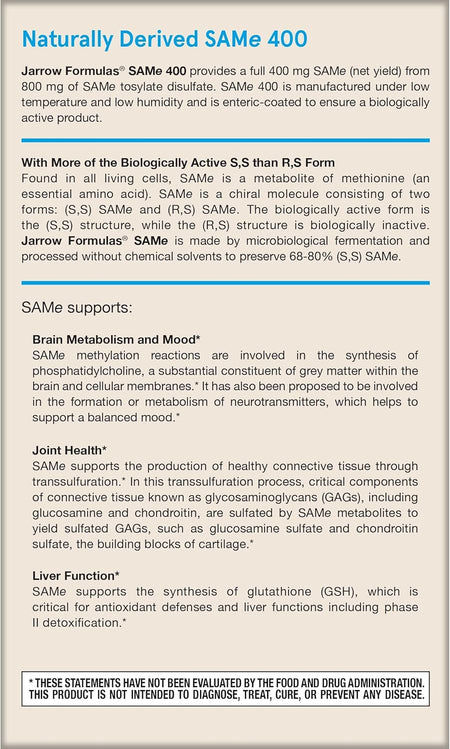 SAMe (S-Adenosylmethionine) is an amino acid derivative that has undergone dozens of trials involving thousands of patients and has been clinically proven to benefit brain and joint function. Found in all living cells, SAMe is also called activated methionine (an essential amino acid) since it is formed by the combining of ATP with methionine. SAMe 400 is manufactured under low temperature and low humidity and is enteric-coated to ensure a biologically active product. It is made naturally by microbiological fermentation and then specially processed to preserve 68-80% (S,S) SAMe, the highest active level available.