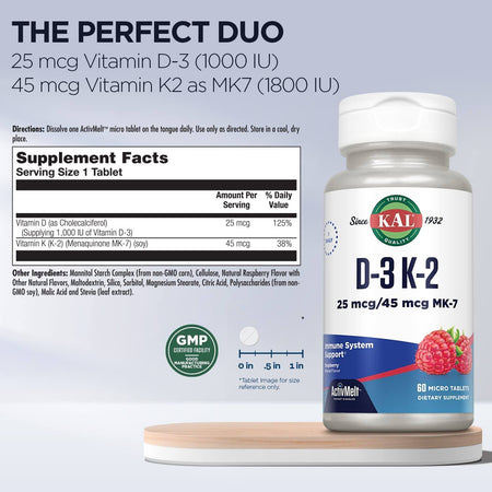 Thanks to KAL® D-3 K-2, promoting healthy bones has never been tastier! Each delicious red raspberry-flavored micro-tablet delivers 25 mcg (1,000 IU) of vitamin D-3 and 45 mcg of vitamin K-2 as MK-7. These two vitamins work together to support bone and cardiovascular health.