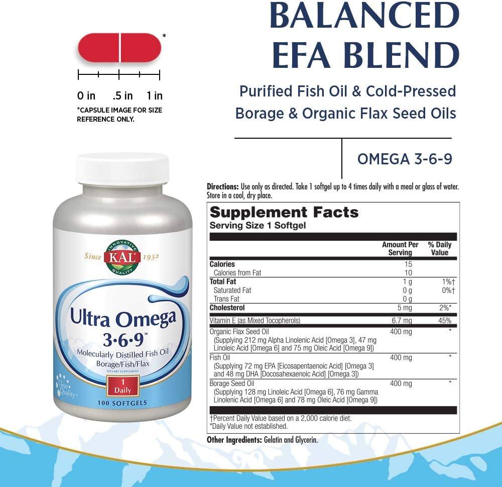 Today's North American diet is typically low in Omega 3. A shortage of Omega 3 in the diet disrupts the balance of Essential Fatty Acids in the body. This formula provides a delicate balance of Omega 3, Omega 6 and Omega 9 with added Vitamin E to help prevent oxidation. Borage and organic flax seed oils are cold pressed and solvent free. Molecularly Distilled fish oil comes from cold water fish. KAL fish oils go through a purity process, including molecular distillation, to remove heavy metals, PCBs, dioxins, furans and other contaminants to meet superior fish oil standards.