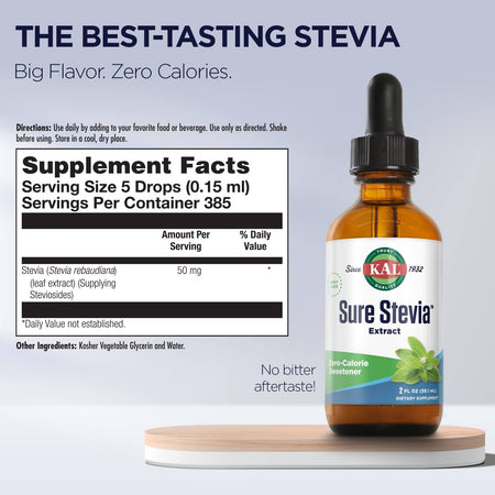 Kal Sure Stevia Liquid is a natural sweetener and sugar substitute that can be used for cooking, baking, and freezing. Stevia separates itself from other sweeteners because it is an herbal supplement, and offers numerous health benefits. Research has shown that Stevia helps regulate blood pressure, lower blood-sugar levels, lessen the effects of colds and flu, strengthen hair, and relieve indigestion. Next time you are cooking your favorite recipe, use Stevia in place of sugar as a healthy, low-calorie alternative.