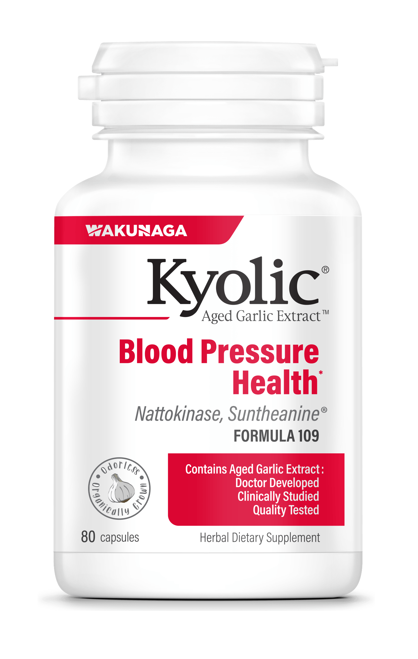Kyolic® Aged Garlic Extract™ Formula 109 for blood pressure health contains 400 mg of AGE along with Nattokinase, an enzyme extracted from natto (fermented soy) and L-Theanine, a nutrient found in green tea per serving. Clinical studies for each of these ingredients have shown to support healthy blood pressure levels, already within normal ranges.