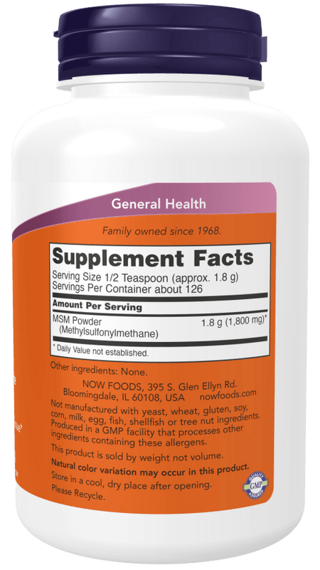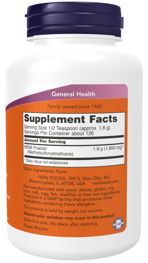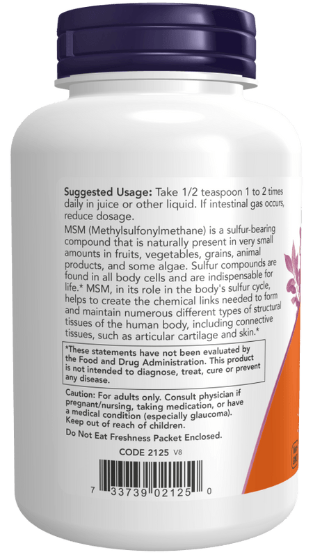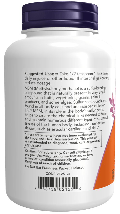 MSM (Methylsulfonylmethane) is a sulfur-bearing compound that is naturally present in very small amounts in fruits, vegetables, grains, animal products, and some algae. Sulfur compounds are found in all body cells and are indispensable for life.* MSM, in its role in the body's sulfur cycle, helps to create the chemical links needed to form and maintain numerous different types of structural tissues of the human body, including connective tissues, such as articular cartilage and skin.*