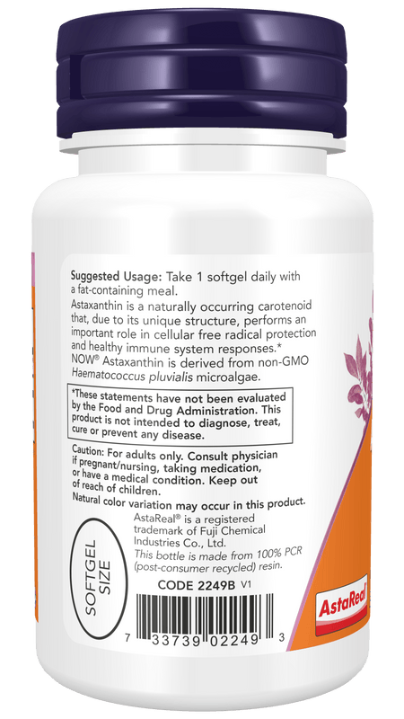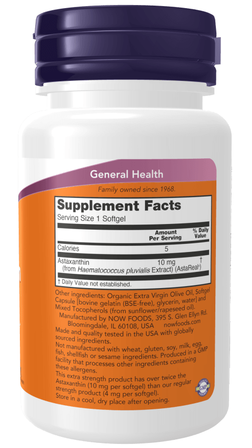 Astaxanthin is a naturally occurring carotenoid that, due to its unique structure, performs an important role in cellular free radical protection and healthy immune system responses.* NOW® Astaxanthin is derived from Non-GMO Haematococcus pluvialis microalgae.