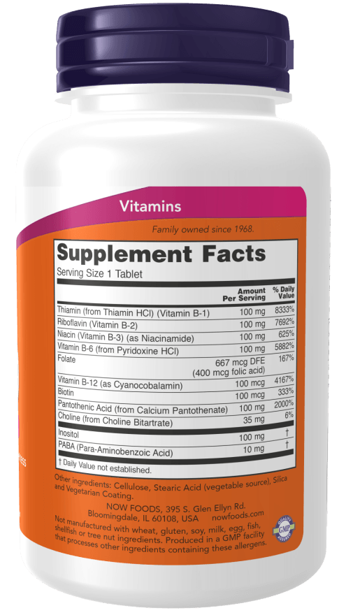 B-100 Tabs provide a full complement of B-vitamins plus choline and inositol. These vitamins work to support energy production, maintain healthy homocysteine metabolism, and promote the health of the nervous system.* B-vitamins are water soluble, and with the exception of B-12, have limited storage in the body and thus require daily replenishment. While B-12 is stored in the liver, dietary sources are of animal origin only (meat and dairy) and supplementation with B-12 may be especially important for vegetarians.