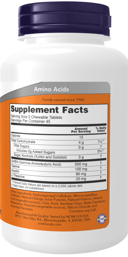 GABA (gamma-aminobutyric acid) is a non-protein amino acid that functions as a neurotransmitter in the human brain.* GABA is naturally produced in the body and its presence within the central nervous system may help promote relaxation and ease nervous tension.* Delicious orange flavor NOW® Chewable GABA combines this naturally occurring neurotransmitter with the relaxing amino acids taurine and theanine for their complementary functions.*