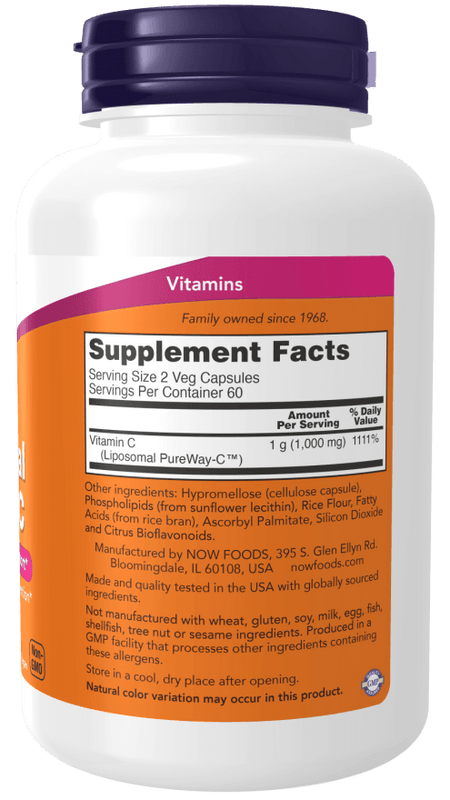 NOW® Liposomal Vitamin C features PureWay-C™, vitamin C in a fat-soluble delivery system that has demonstrated enhanced absorption, cellular uptake, and bodily retention in clinical studies as compared to other forms of vitamin C.* Vitamin C is a powerful antioxidant that is also necessary for collagen synthesis, the maintenance of capillary and blood vessel integrity, cartilage and bone health, normal immune function, and nerve impulse transmission.*