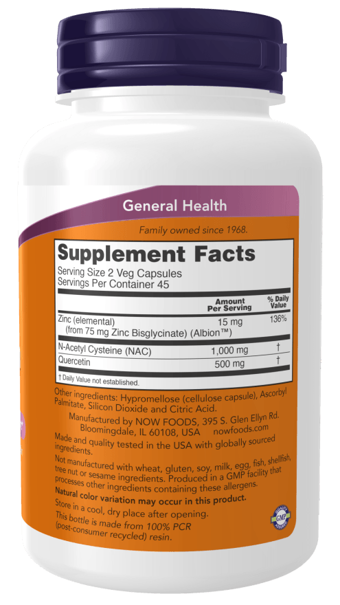 - 1,000 mg NAC, 500 mg Quercetin & 15 mg Zinc per serving