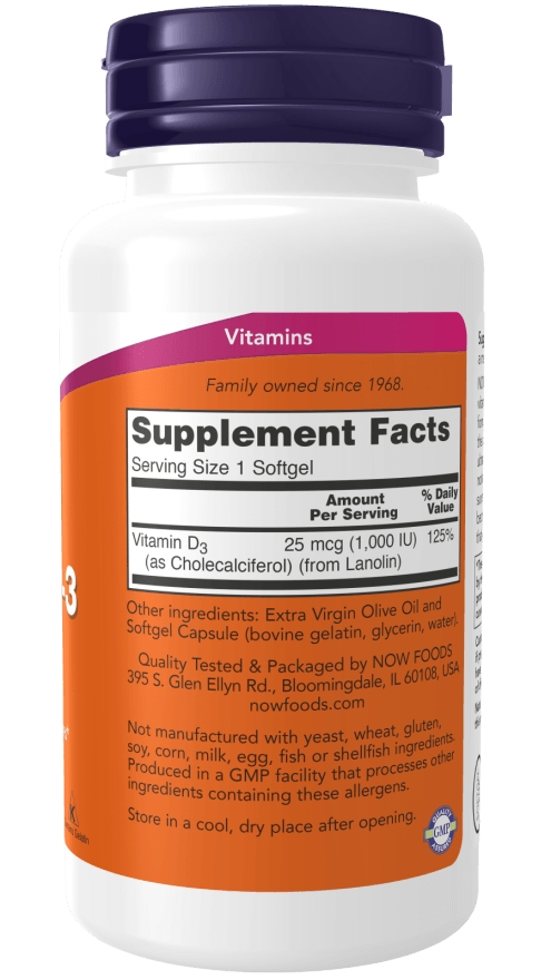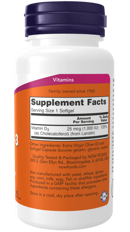 NOW® Vitamin D-3 softgels supply this key vitamin in a highly absorbable liquid softgel form. Vitamin D is normally obtained from the diet or produced by the skin from the ultraviolet energy of the sun. However, it is not abundant in food. As more people avoid sun exposure, vitamin D supplementation becomes even more necessary to ensure that your body receives an adequate supply.