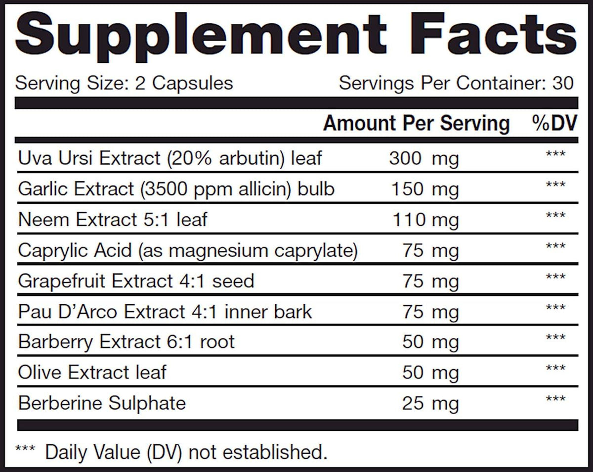 15-day; 2-part program; part 1: 60 vegetable capsules and part 2: 1 ounce tincture^Made with specially selected herbs and natural ingredients Addresses intestinal yeast Supports urinary tract health Gluten free and dairy free