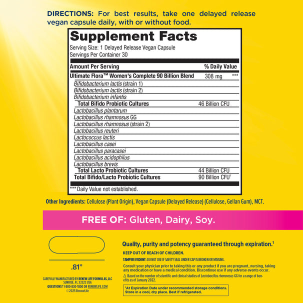 Are you looking for a probiotic that's designed to answer your specific needs? If so, then look no further, because Renew Life Ultimate Flora Women's Care Probiotic is top-rated! Ultimate Flora Women's Care Probiotic is a potent once-daily probiotic blend that features 90 billion live cultures and 12 specially selected probiotic strains packed into delayed-release capsules for targeted delivery. This formula promotes and nourishes the digestive tract health, boosts vaginal microflora and supports the immune system. This blend includes Lactobacillus acidophilus, Lactobacillus gasseri, Bifidobacterium lactis and much more.