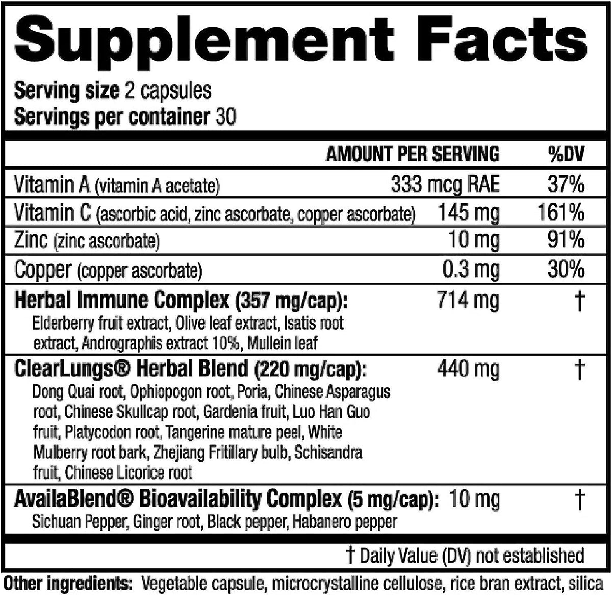 Vitamin V (vitamin A acetate), Vitamin C (ascorbic acid, zinc ascorbate, copper ascorbate), Zinc (zinc ascorbate), Copper (copper ascorbate). Herbal Immune Complex (357 mg/cap): Elderberry fruit extract, Olive leaf extract, lsatis root extract, Andrographis extract 10%, Mullein leaf. ClearLungs Herbal Blend (220 mg/cap): Dong Quai root, Ophiopogon root, Poria fungal body, Chinese Asparagus root, Chinese Skullcap root, Gardenia fruit, Luo Han Guo fruit, Platycodon root, Tangerine mature peel, Whie Mulberry root bark, Zhejiang Fritillary bulb, Schisandra fruit, Chinese Licorice root. AvailaBlend Bioavailability Complex (5 mg/cap): Sichuan Pepper, Ginger root, Black pepper, Habanero pepper. Other ingredients: Vegetable capsule, microcrystalline cellulose, rice bran extract, silica.