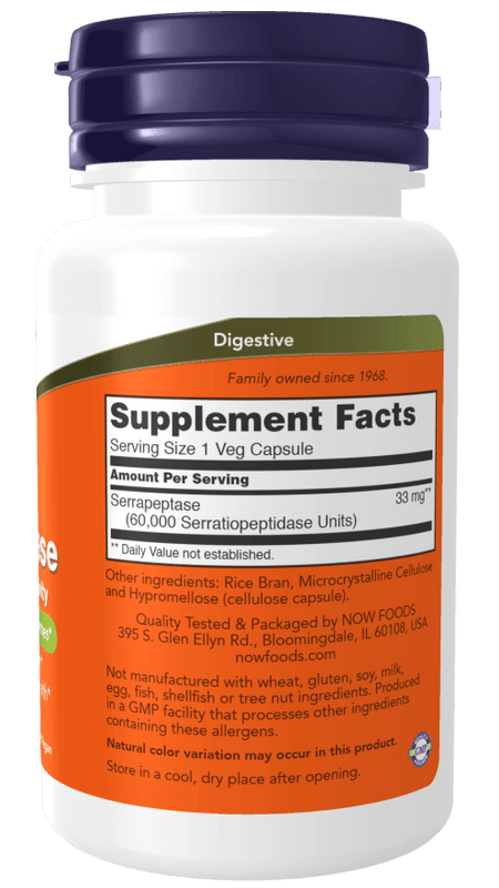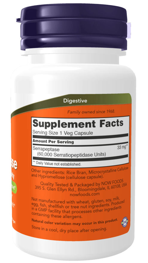 Serrapeptase (serratiopeptidase) is a protein-digesting enzyme isolated from the friendly bacterium Serratia marcescens.* Studies indicate that serrapeptase is absorbed intact from the digestive tract and that it acts systemically to support healthy immune system functions and promote the body’s normal healing processes.* Some evidence suggests that serrapeptase may support respiratory health by helping to maintain normal mucus secretions.*