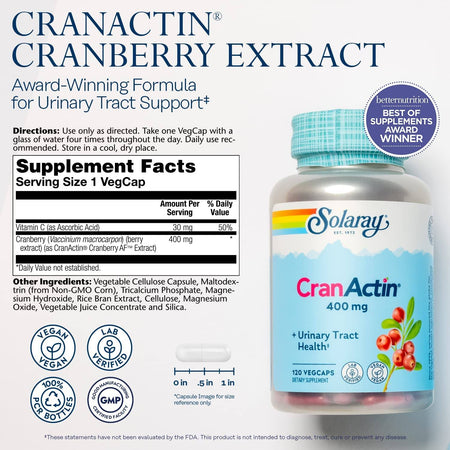 An award-winning formula, CranActin Cranberry Extract is designed to help support urinary tract and bladder health. Compounds found in cranberry may help keep bacteria from adhering to bladder cells and Solaray CranActin is formulated to provide this Bacterial Anti-adherence Factor. Additionally, our powerful formula includes Vitamin C to help support healthy immune function.