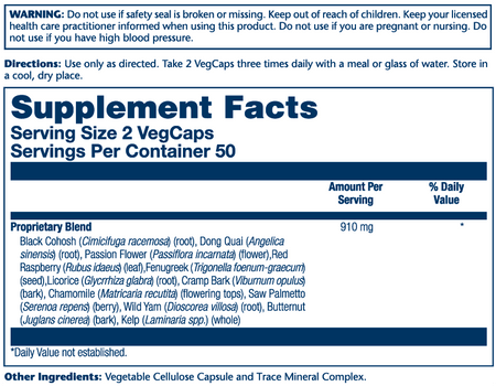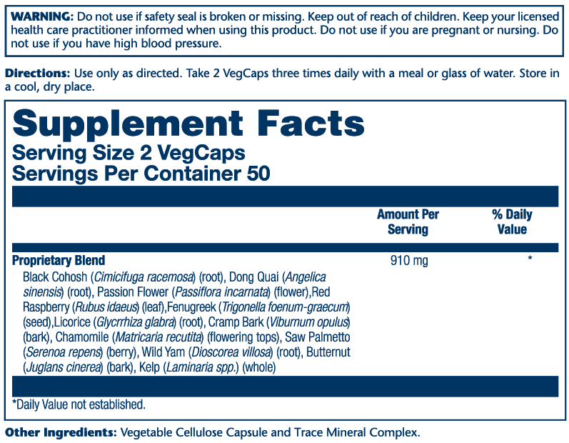 Our special blend also includes passion flower, red raspberry, fenugreek, licorice, cramp bark, chamomile, saw palmetto, wild yam, butternut & kelp along with added mineral salts for increased support.