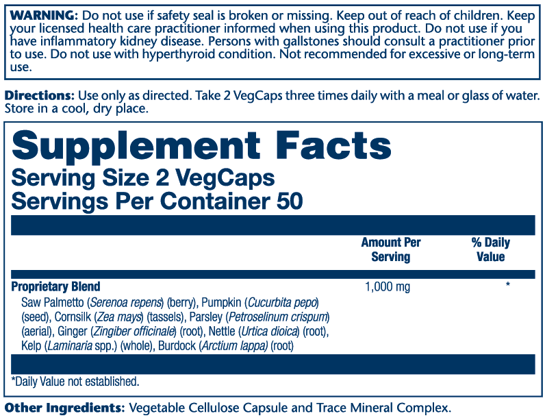 | Proprietary Blend Saw Palmetto (Serenoa repens) (berry), Pumpkin (cucurbita pepo) (seed), Cornsilk (Zea Mays) (tassels), Parsley (Petroselinum crispum) (aerial), Ginger (Zingiber officinale) (root), Nettle (Urtica dioica) (root), Kelp (Laminaria spp.) (whole), Burdock (Arctium lappa) (root) |