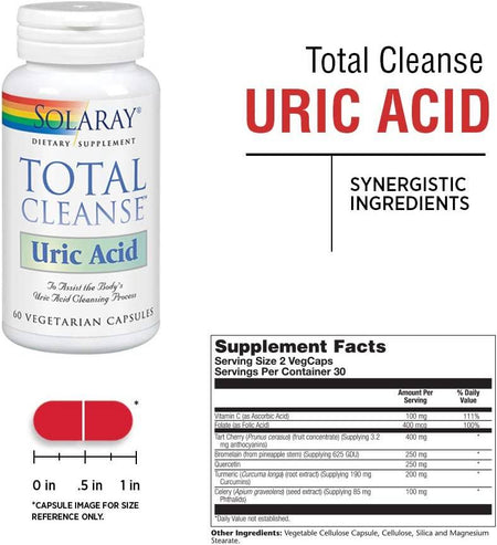 Solaray Total Cleanse Uric Acid consists of synergistic ingredients including tart cherry, bromelain, quercetin, turmeric and celery. Along with eating a balanced diet, these powerful ingredients may help provide nutritive support for maintaining healthy uric acid levels and more comfortable joints. Always committed to crafting superior supplements that just work better, Solaray Total Cleanse Uric Acid does not contain any artificial colors, flavors, or preservatives.