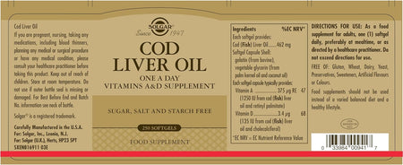 Solgar® Cod Liver Oil provides healthy omega fatty acids, Vitamin A and D to support a healthy immune system, promote healthy eyes and vision, and support bone health. The oil used in this formulation has been molecularly distilled to remove contaminants.
