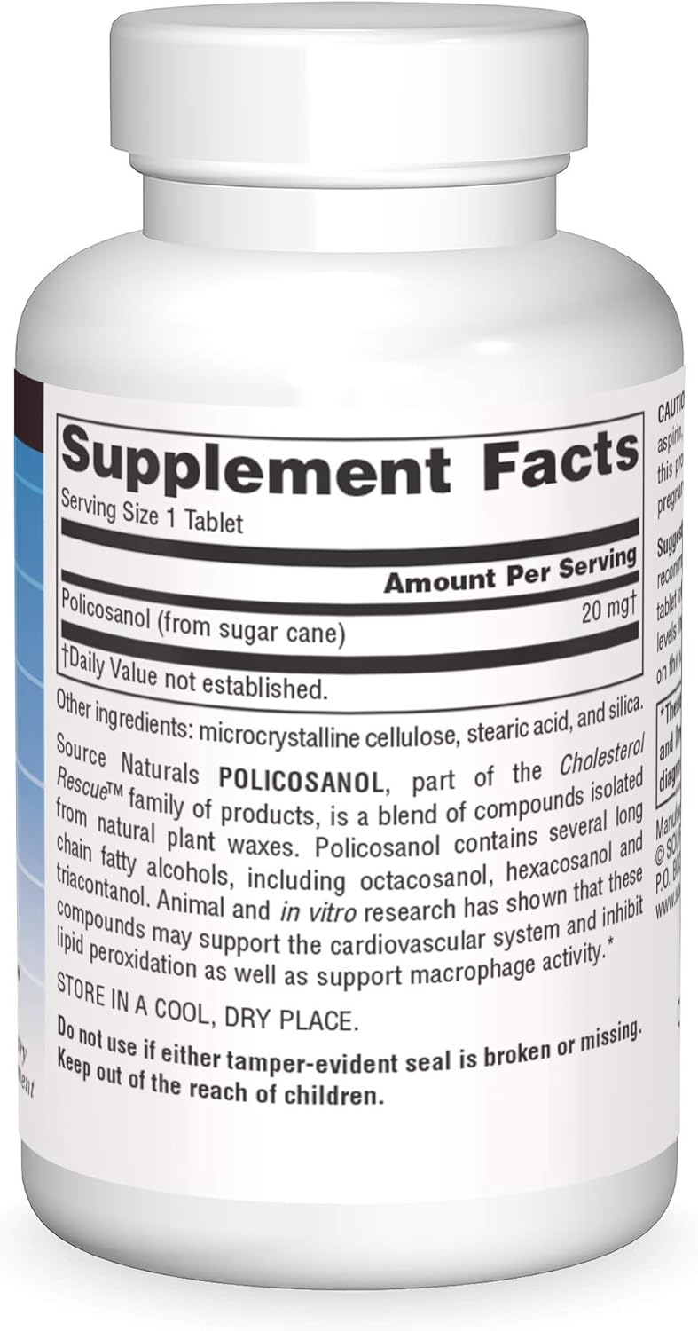 Source Naturals Policosanol, part of the Cholesterol Rescue™ family of products, is a blend of compounds isolated from natural plant waxes. Policosanol contains several long chain fatty alcohols, including octacosanol, hexacosanol and triacontanol. Animal and in vitro research has shown that these compounds may support the cardiovascular system and inhibit lipid peroxidation as well as support macrophage activity