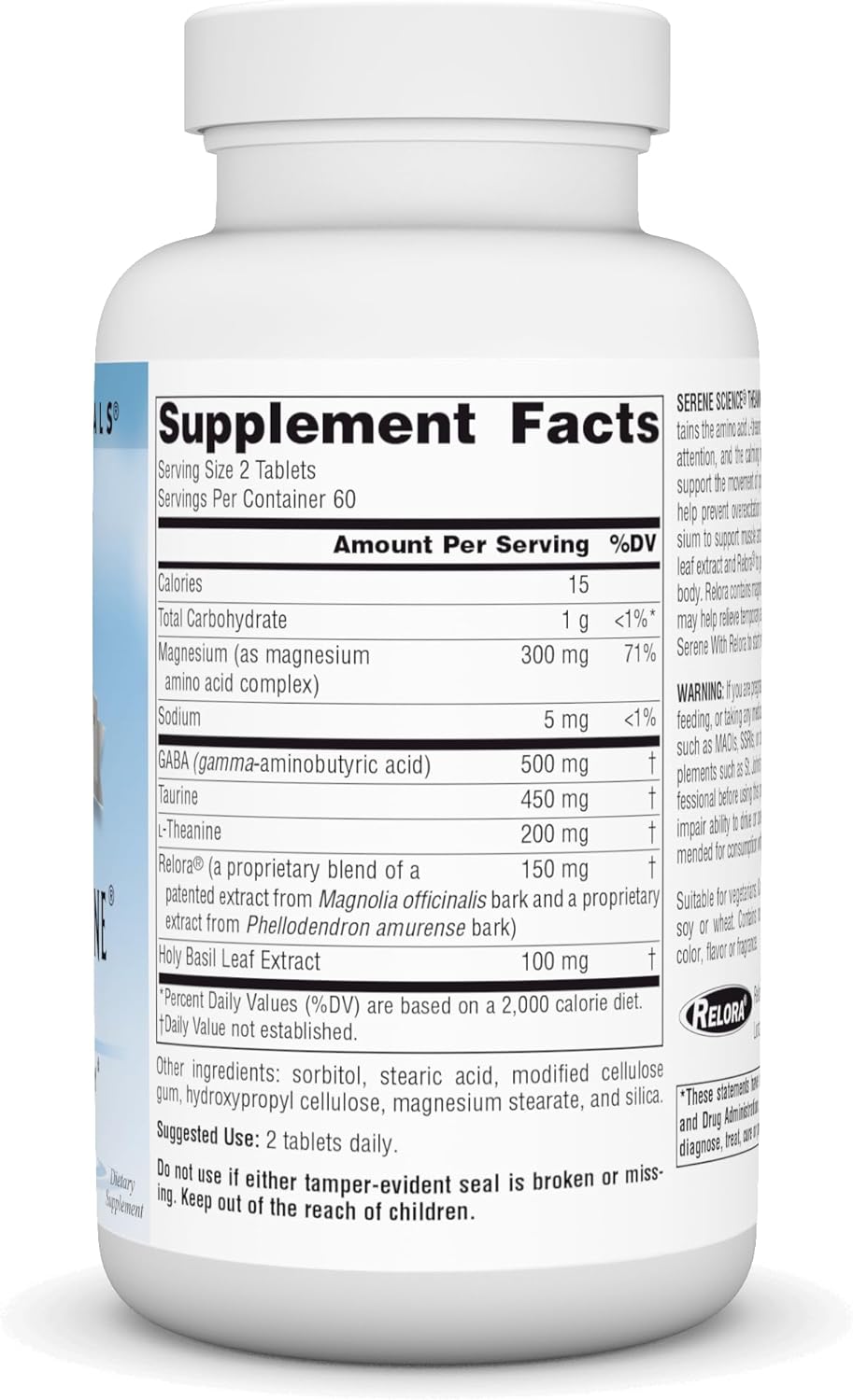 SERENE SCIENCE® THEANINE SERENE® WITH RELORA® contains the amino acid l-theanine, to support relaxation and focused attention, and the calming neurotransmitter GABA. Taurine can support the movement of potassium out of neurons, which may help prevent overexcitation of neurons.