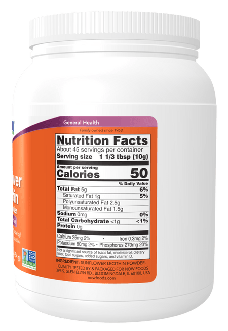 NOW® Sunflower Lecithin Powder has phosphatidyl choline, the most abundant phospholipid in the cell membrane. It also naturally abounds in phosphatidyl inositol, phosphatidyl ethanolamine, and essential fatty acids. Lecithin aids in emulsifying fats, enabling them to be dispersed in water. NOW® Sunflower Lecithin Powder is soy free and non-GMO.