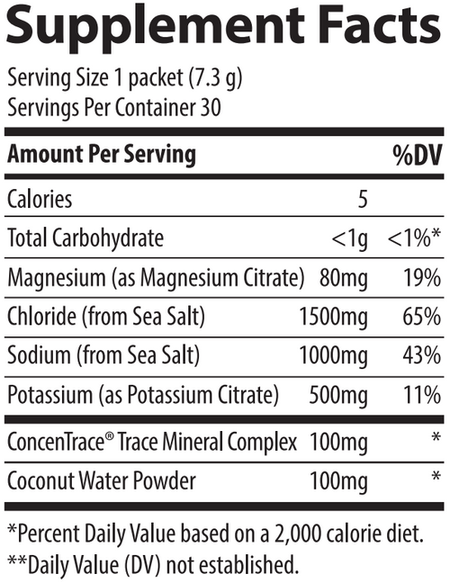 ZEROLyte is a sodium and electrolyte drink pack designed to replenish essential electrolytes lost during exercise and daily activities. It keeps your body hydrated and energized while supporting proper nerve and muscle function. Packed with quality ingredients like ancient sea salt, coconut water, potassium, magnesium, and a full spectrum of ionic trace minerals.