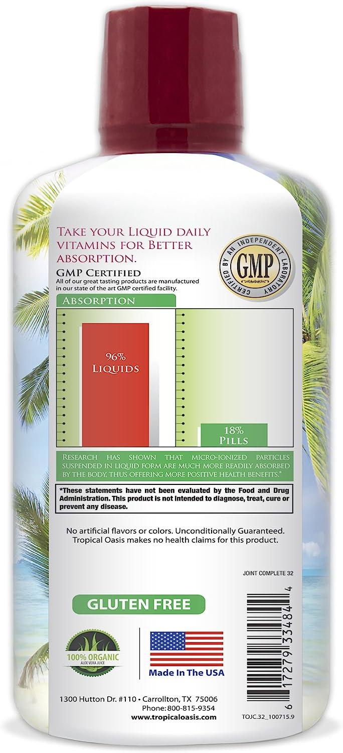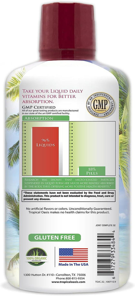 Tropical Oasis Joint Complete contains Glucosamine, Chondroitin, MSM, Hyaluronic acid, and Vitamin C to promote optimal joint health and joint pain relief.