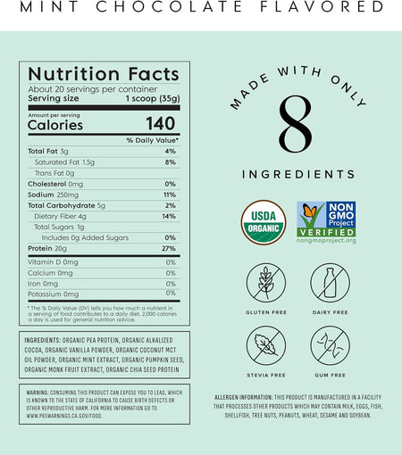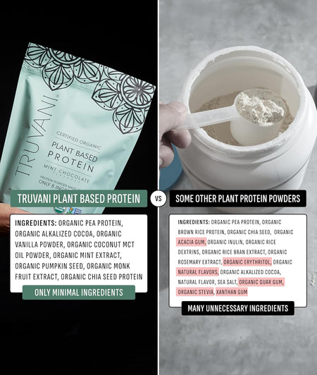 Truvani's USDA Organic mint chocolate plant based protein is made with only 8 ingredients. Its non-gritty texture and delicious taste will have you on cloud nine.