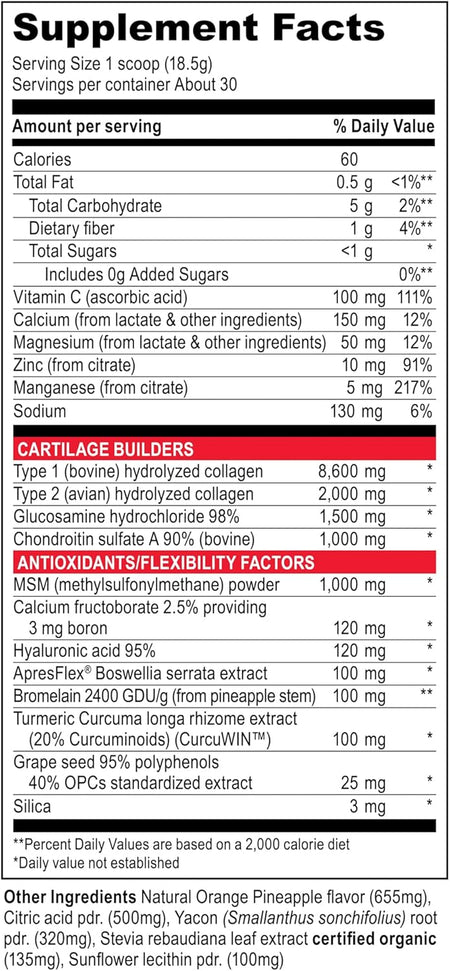 It delivers 10,600 mg of type 1 and type 2 collagen per serving to nourish cartilage-building cells and promote the natural synthesis of hyaluronic acid. Antioxidants and botanical ingredients are included to support a healthy inflammatory response and overall joint function.