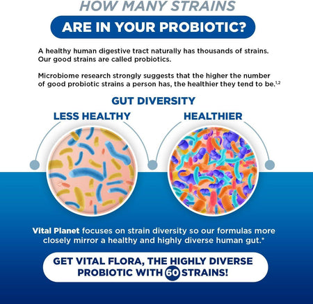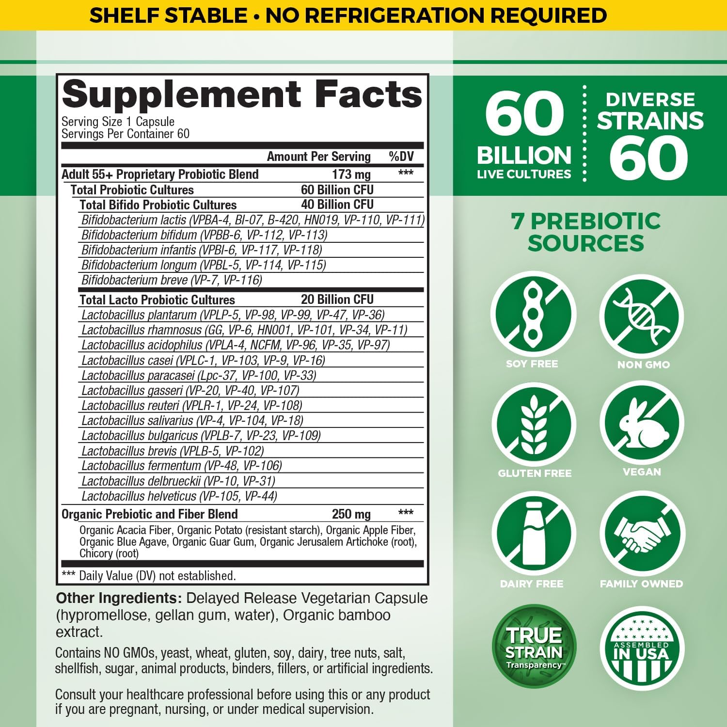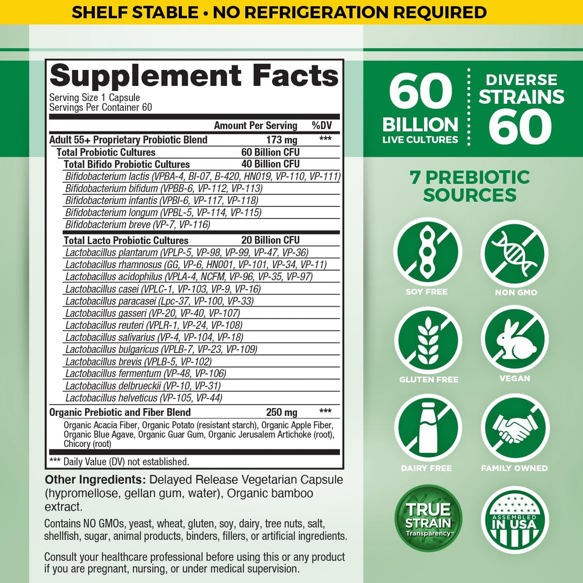 Vital Flora Adult 55+ Daily Probiotic, 60 Billion CFU, 60 Diverse Strains + 7 Organic Prebiotics